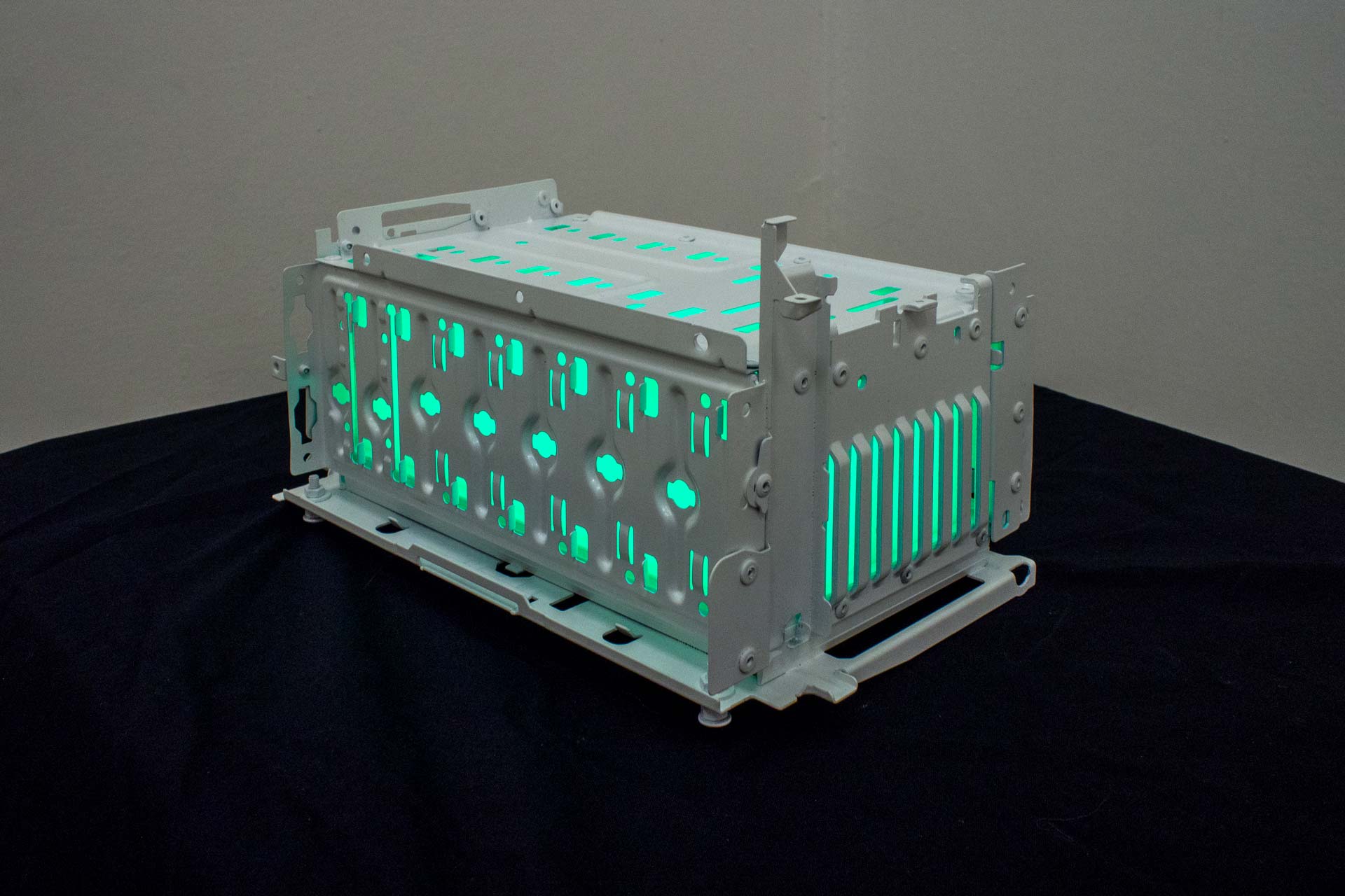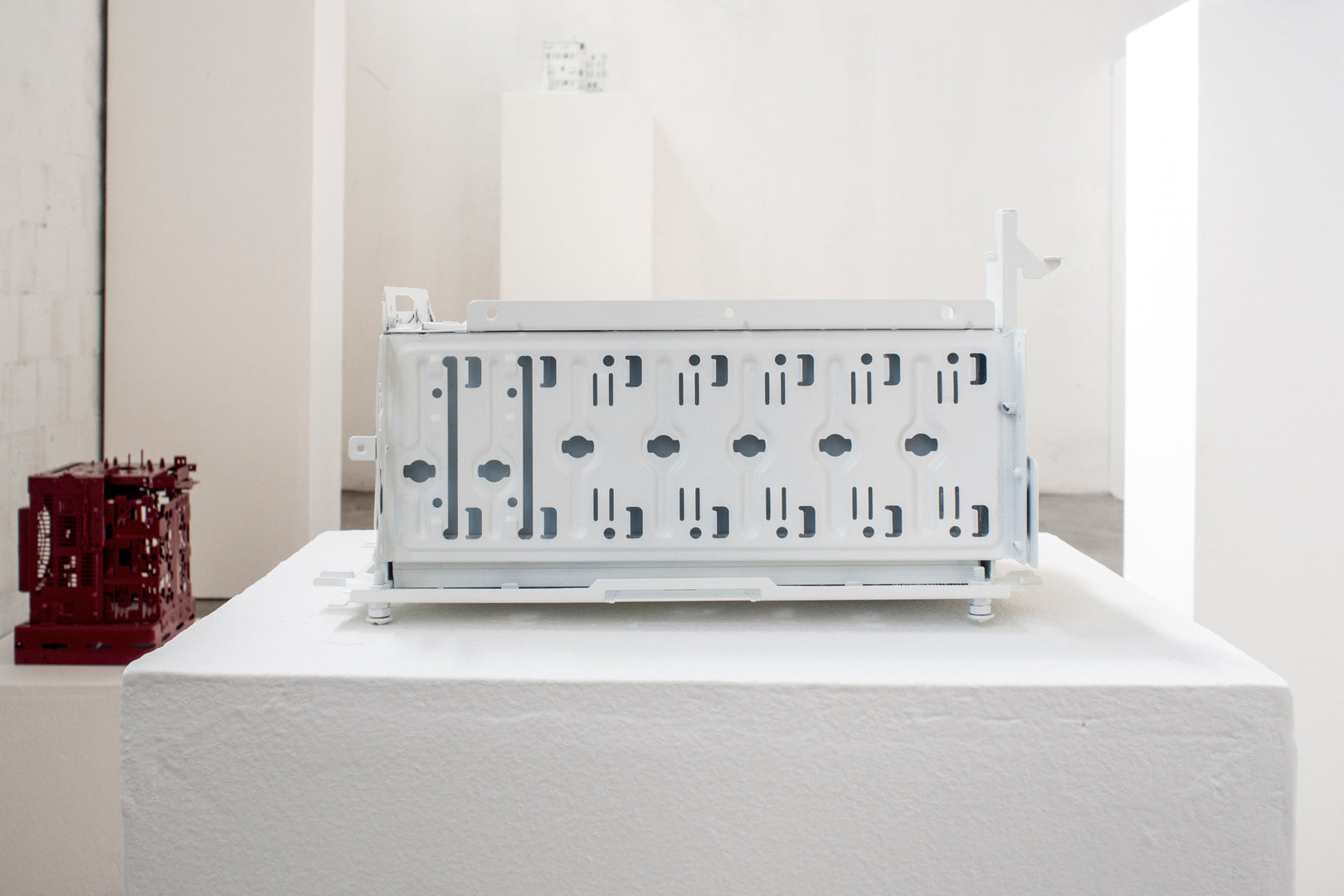 Luminous sculptural building created with metal objects, obsolete technical components assembled and hot enamelled.