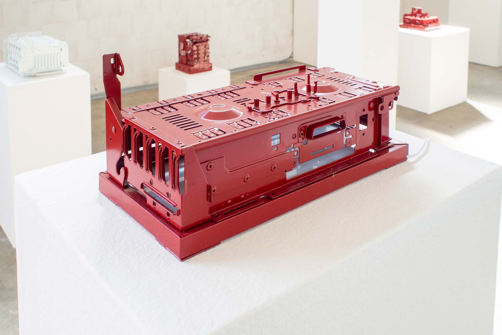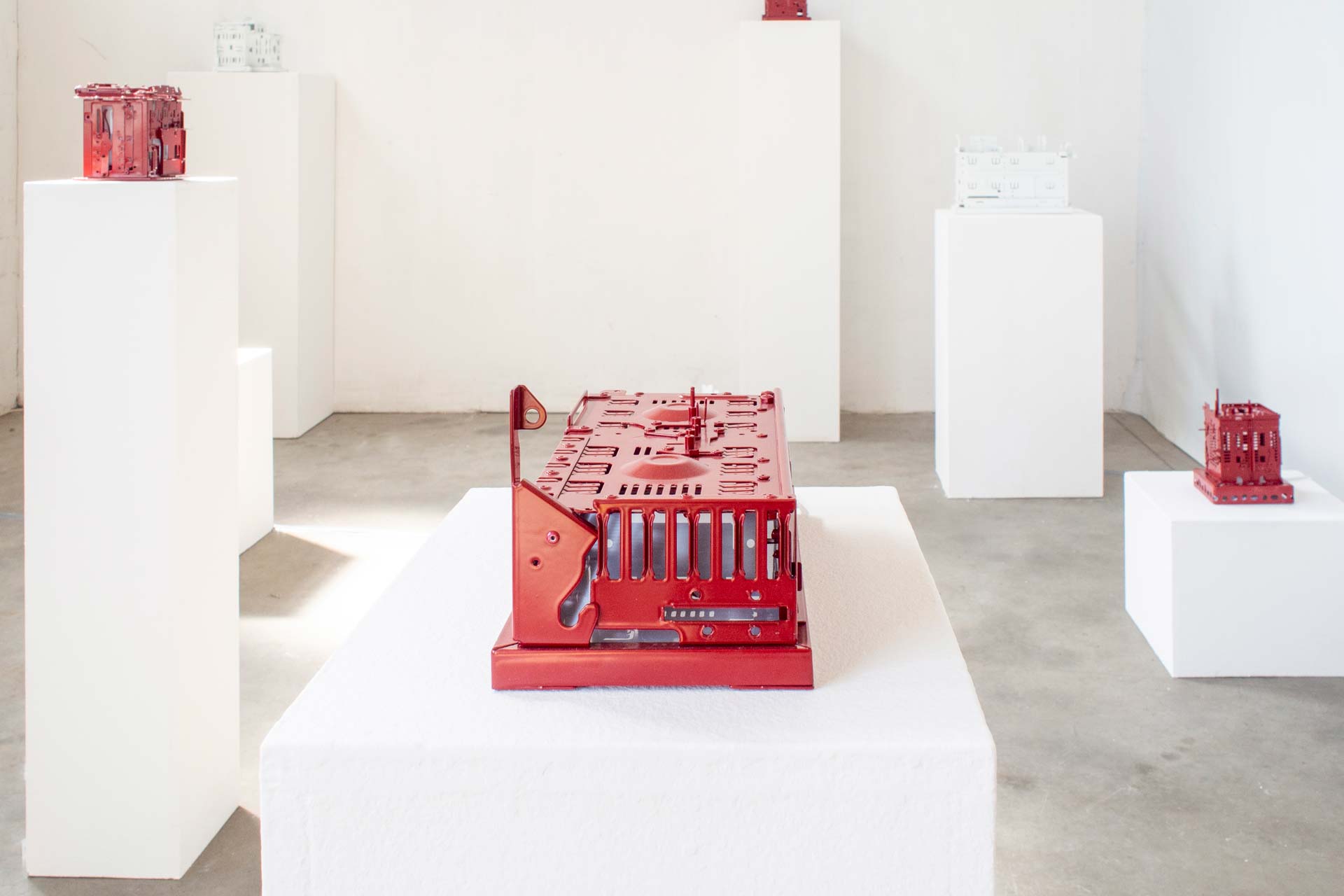 Luminous sculptural building created with metal objects, obsolete technical components assembled and hot enamelled.