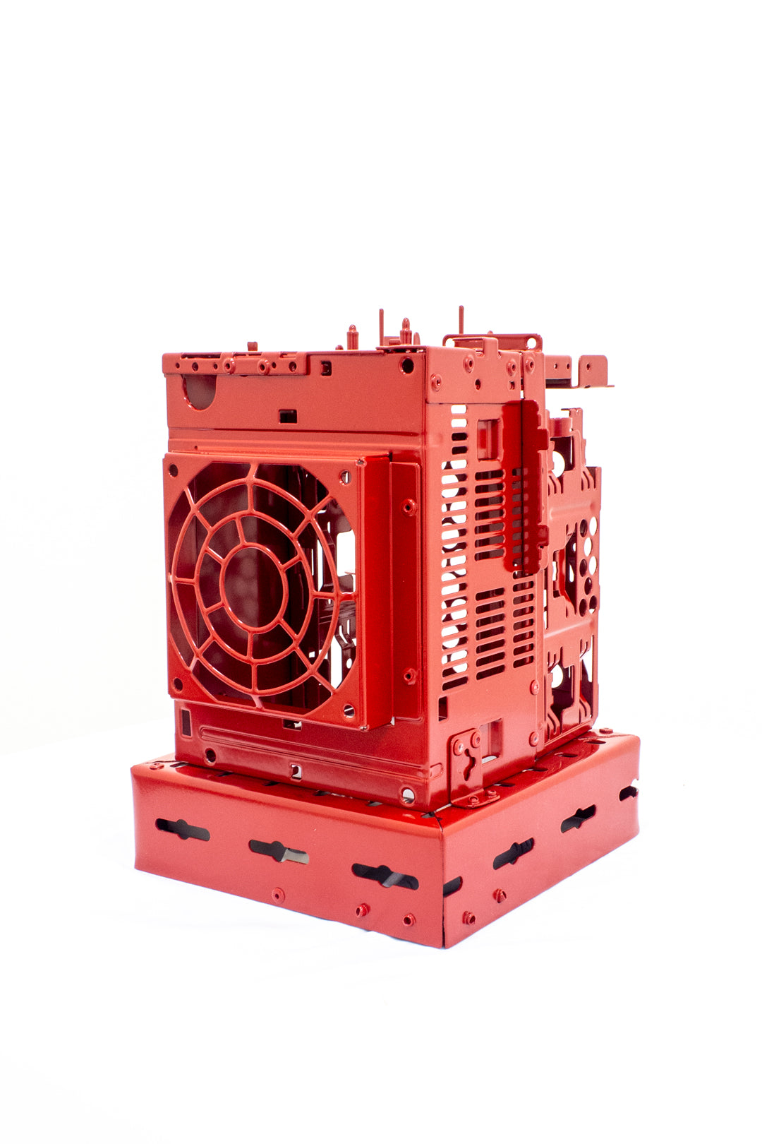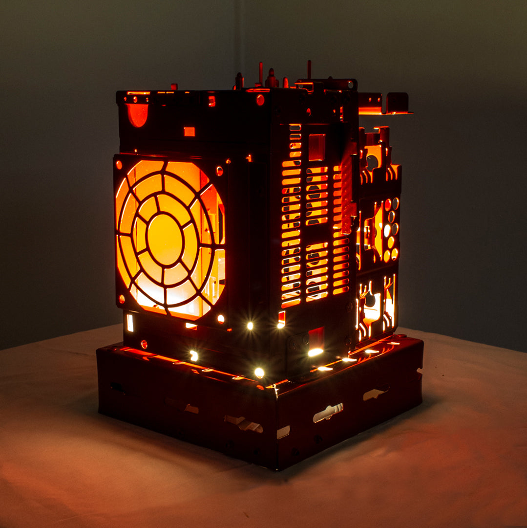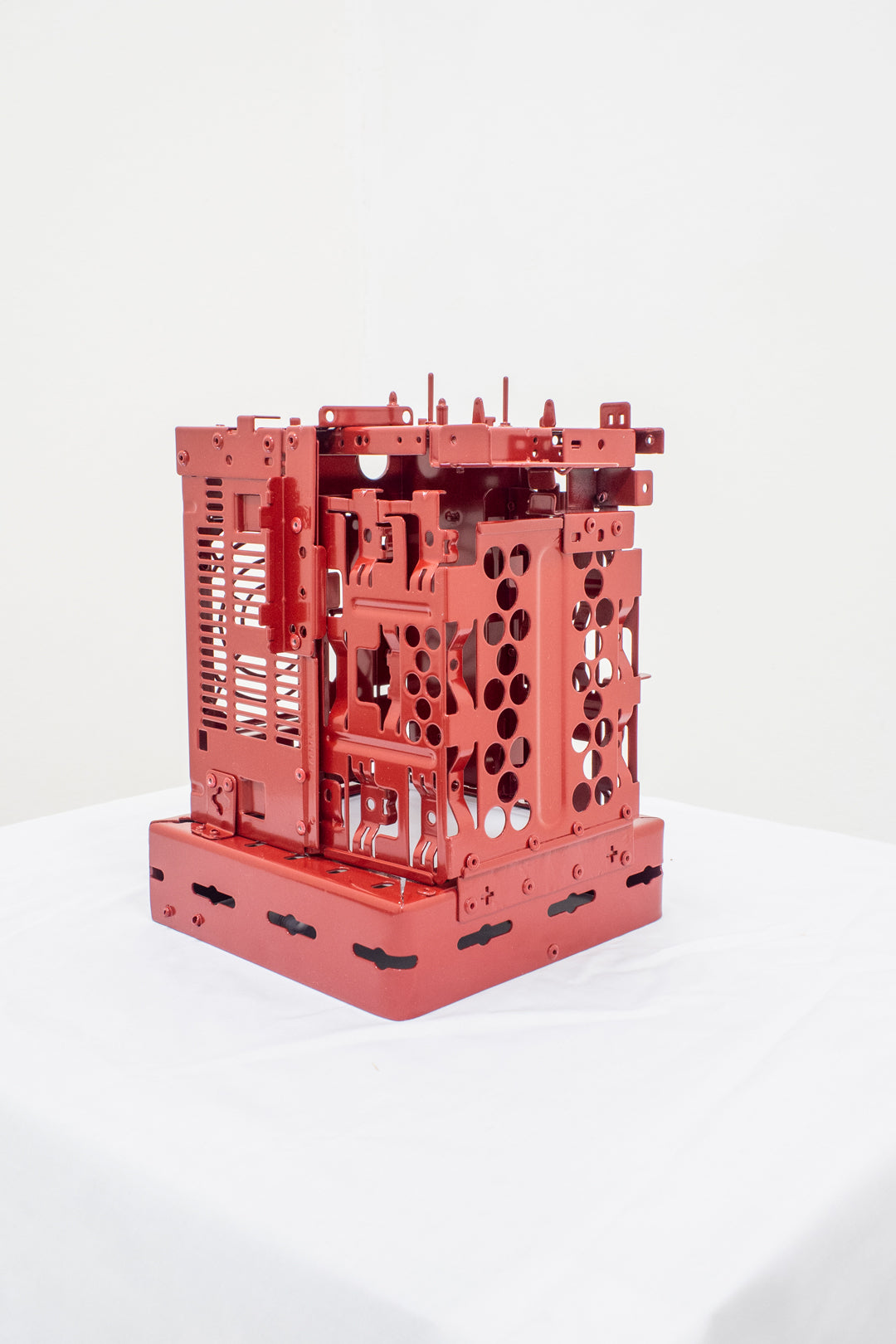 Luminous sculptural building created with metal objects, obsolete technical components assembled and hot enamelled.