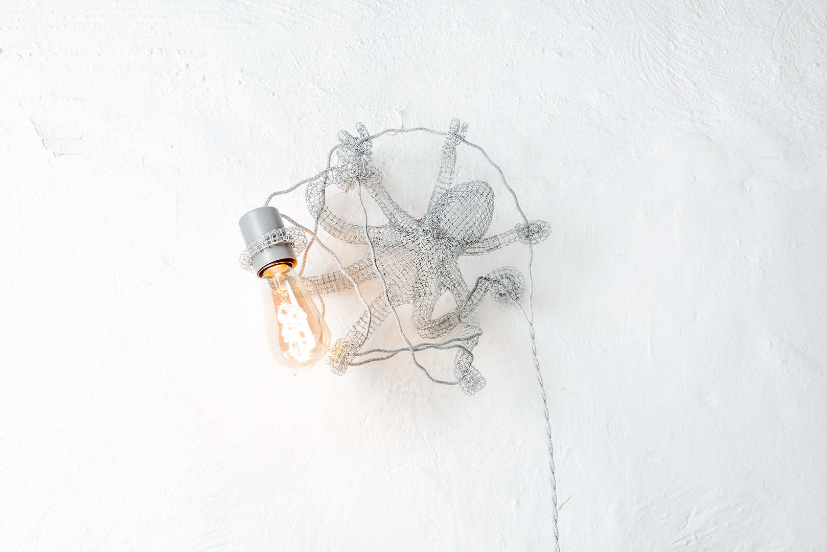 Octupus created with galvanized wire mesh holding a lamp with white cable